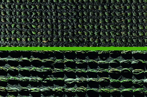 Abb. Rückseite eines Kunstrasens mit hoher und niedriger Stichzahl